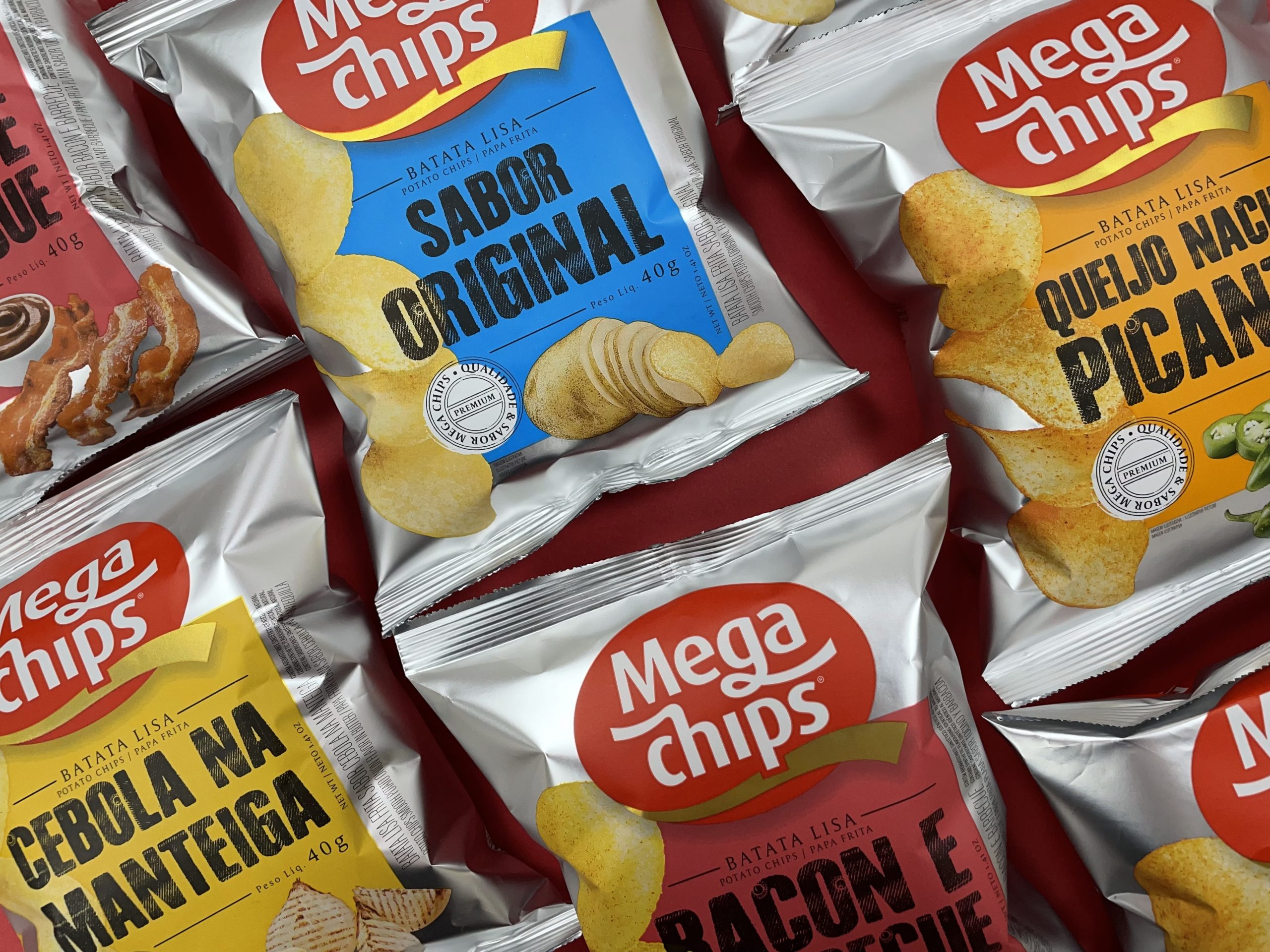 A linha de chips "batata lisa" da Mega Chips é formada por quatro produtos: sabor queijo nacho picante, cebola na manteiga, bacon e barbecue e sabor original. A embalagem, para 40g de produto, é impressa em flexografia e tira partido da característica metalizada do material como moldura para destacar o painel frontal. Os produtos se diferenciam pela cor e pelas imagens que remetem ao sabor da batata frita.